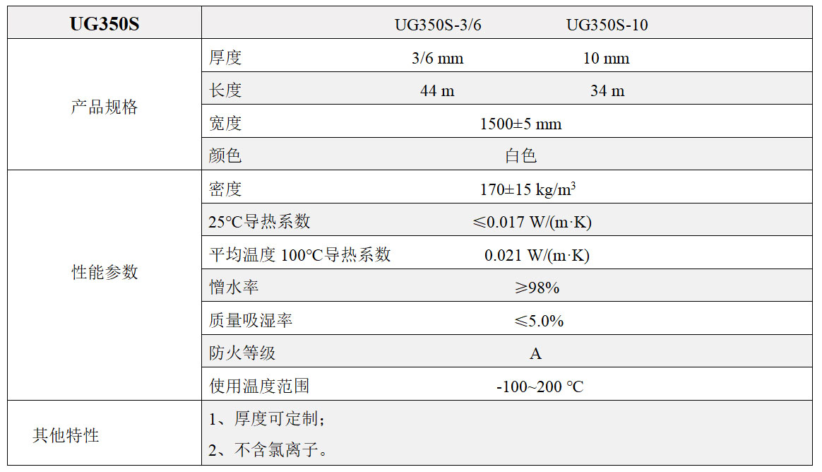 UG350S系列為超低導熱系數(shù)產(chǎn)品,最佳使用溫度為-100℃~200℃。主要應用于高溫熱水管道、低溫蒸汽管道保溫等。